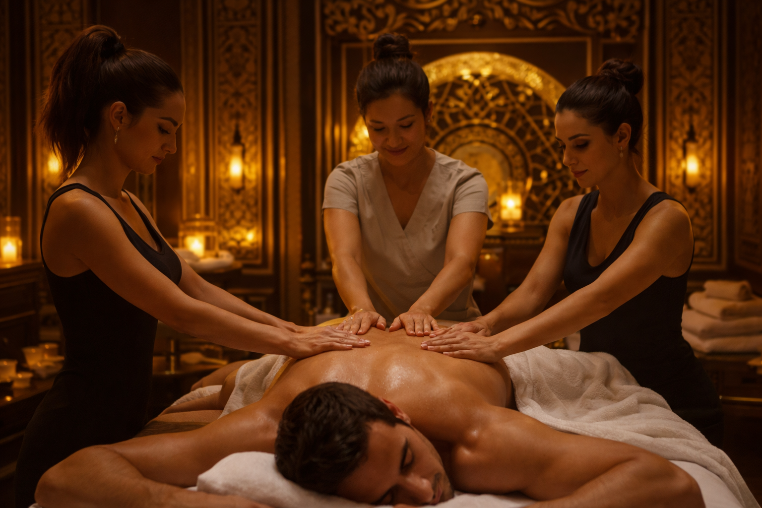 Três massagistas certificadas trabalham ao mesmo tempo, em sincronia. Uma cuida da parte superior do corpo, outra da região lombar e pernas, e a terceira foca nos pontos de maior tensão. Os movimentos são coreografados, não é aleatório. Em poucos minutos, você perde completamente a noção de onde começa e termina cada toque. É uma sensação que não tem como descrever direito. Precisa viver.